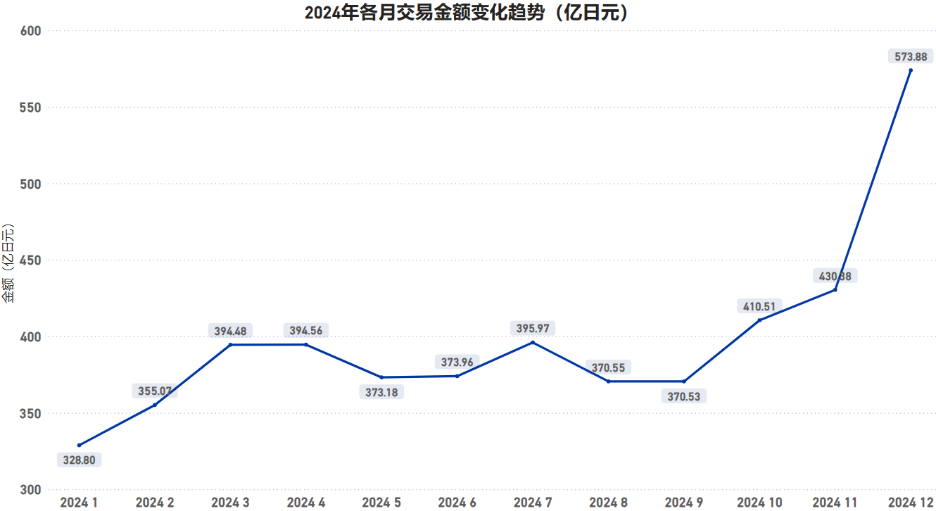 12月:年末节日需求激增,单月交易额创年度最高(573.88亿日元,环比增长33.3%)。